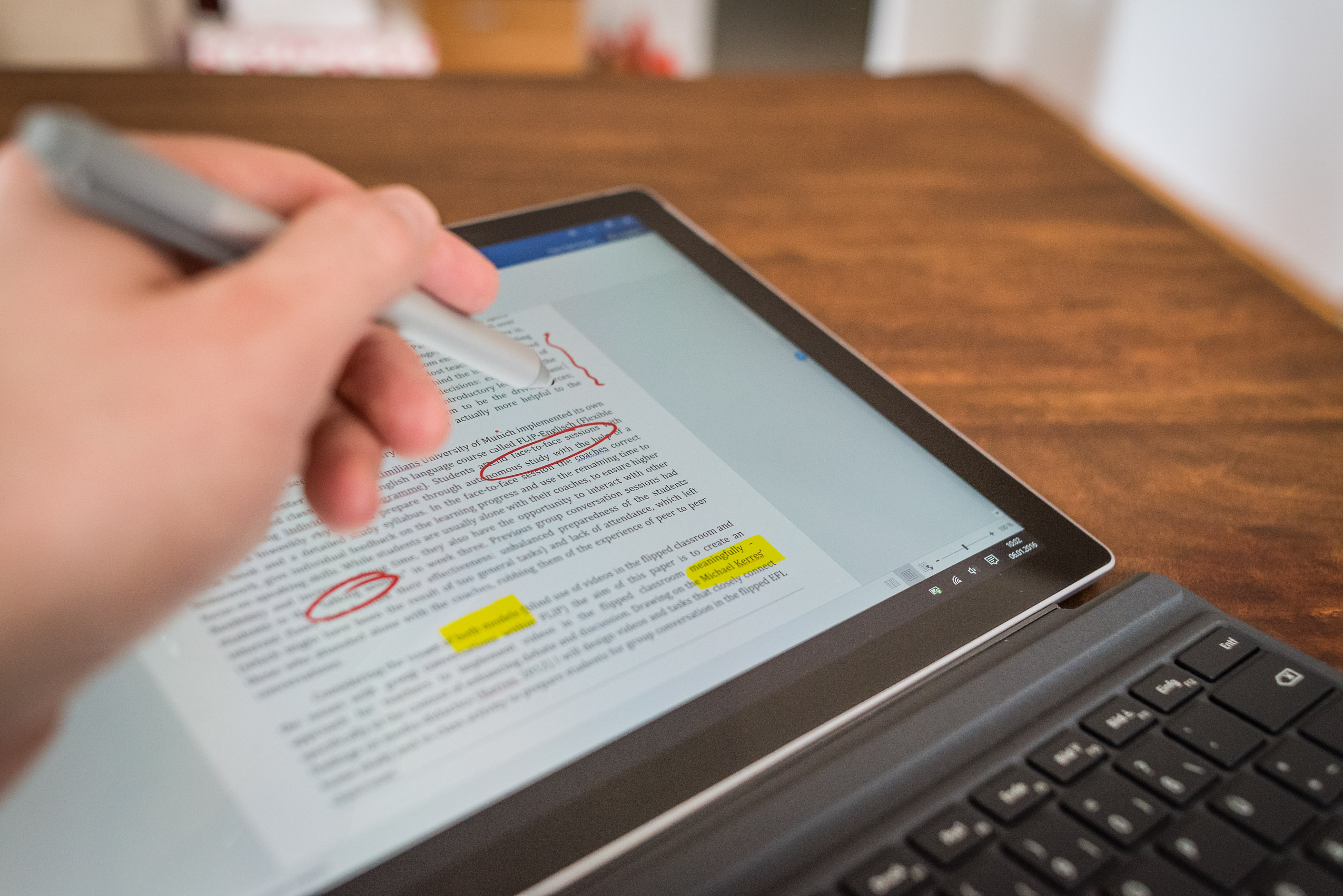 - Korrigieren und Feedback mit dem Stift: Alle Microsoft-Office-Programme (Word, Powerpoint…) sowie das vorinstallierte „PDF-Draw“ unterstützen die Stift-Eingabe. So lassen sich Essays oder Präsentationen relativ einfach digital korrigieren bzw. mit Anmerkungen versehen. Das „Geschmier“ kann beim Empfänger (ohne Surface) nach der Einarbeitung der Änderungen einfach entfernt werden.