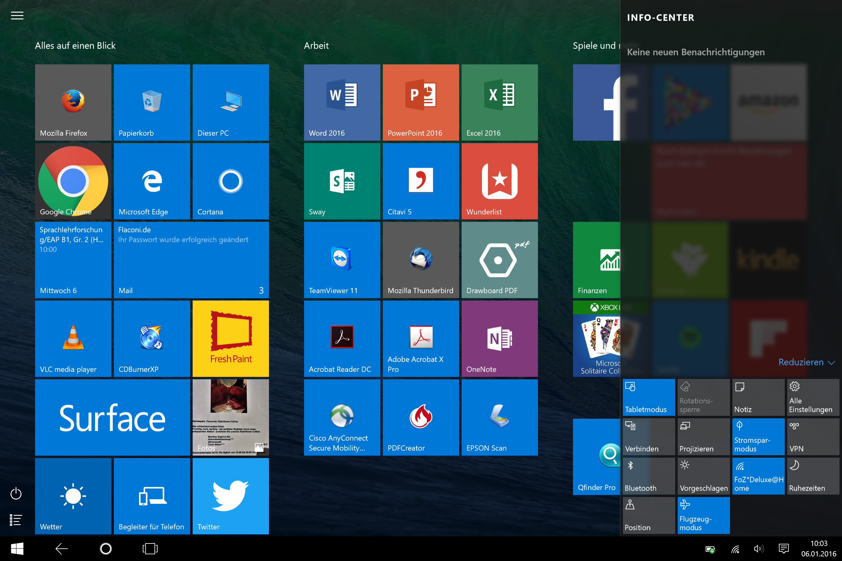 - Im Tablet-Modus: Große Schaltflächen, On-Screen-Tastatur und Benachrichtigungen.